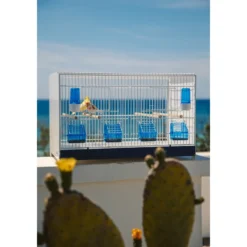 Livrée avec 3 grilles de fond de cage, 12 mangeoires italiennes bleues, 6 abreuvoirs anti-algues bleus, 6 perchoirs en bois et un support sur roulettes.